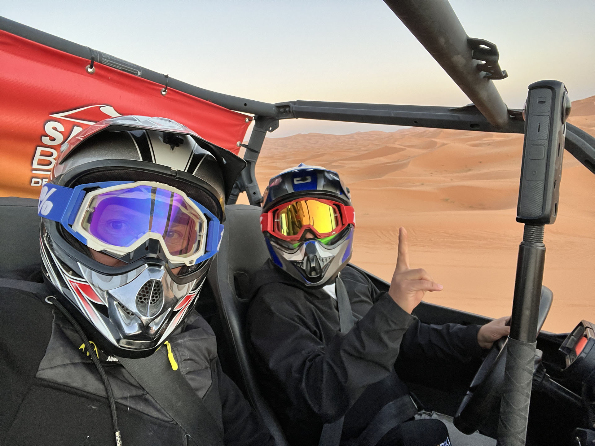 La ruta se pone épica. Cruzamos el Atlas y de repente aparece el desierto. Nada te prepara para esa primera vista del Sáhara. Llegamos a Merzouga cuando la luz se vuelve dorada. Rodamos cerca de las dunas del Erg Chebbi. Al caer la tarde, campamento en jaimas: el cielo abre miles de estrellas y el silencio es tan profundo que parece otro tipo de música.